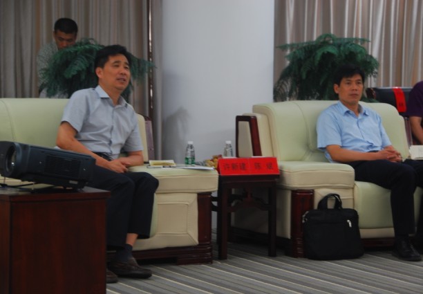 圖為:市文廣新局局長許新建(左)介紹《鹽之城·海之歌》晚會的有關(guān)情況,市委宣傳部副部長陳斌(右)參加座談會。